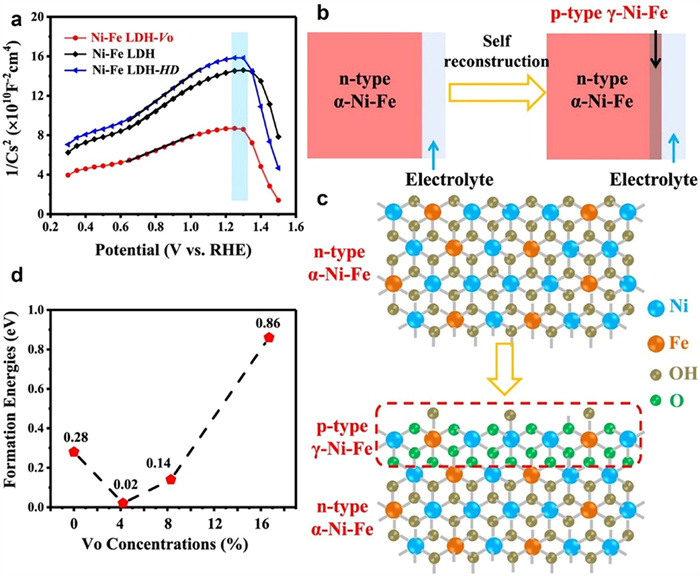 | Fig. 4. (a) Mott–Schottky plots of different catalysts. (b) Schematic diagram of the formation of a p−n interface. (c) Simulated crystal structures of α-Ni-Fe and γ-Ni-Fe/α-Ni-Fe, and (d) the effect of different VO concentrations on the formation energies of γ-Ni-Fe from α-Ni-Fe. Reproduced with permission [79]. Copyright 2021, American Chemical Society. | |