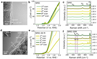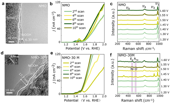 | Fig. 5. The TEM images of (a) NMO and (d) NMO-30M after self-reconstruction. The LSV curves of (b) NMO and (e) NMO-30M with different scans. In situ Raman spectra of (c) NMO and (f) NMO-30M during OER process. Reproduced with permission [14]. Copyright 2023, Springer. | |