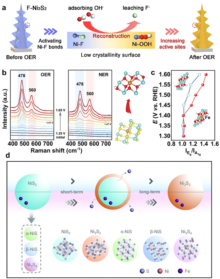 | Fig. 6. (a) Schematic description of the F doping promotes the dynamic reconstruction of Ni3S2 nanoarrays. Reproduced with permission [92]. Copyright 2021, Elsevier. (b, c) In situ Raman of Fe-Ni3S2. Reproduced with permission [63]. Copyright 2023, Wiley Publishing Group. (d) Schematically showing the dynamic reconstruction of multivalent nickel sulfide catalysts. Reproduced with permission [95]. Copyright 2022, Royal Society Chemistry. | |
