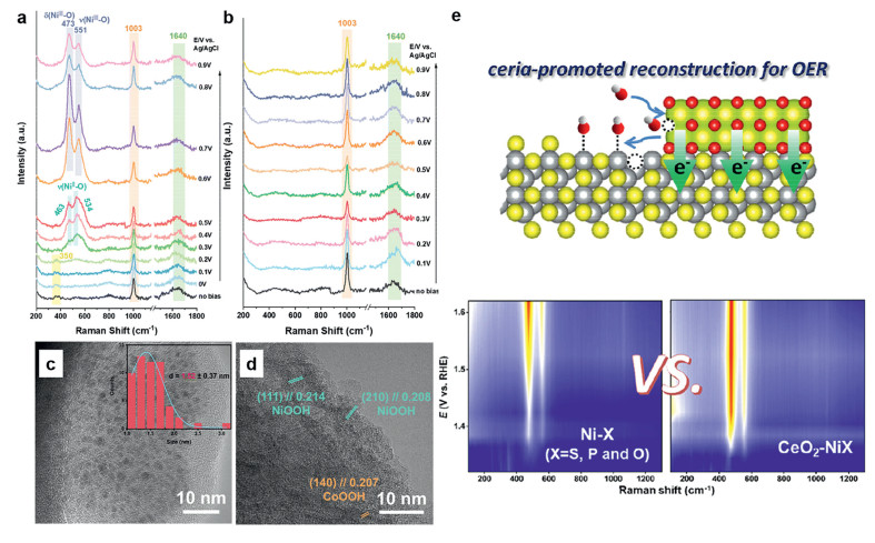 | Fig. 7. (a, b) In situ Raman spectra of Co-Ni-S@NF and Ni-S@NF under urea oxidation. (c, d) The morphology structures of Co-Ni-S@NF after long-term UOR electrocatalysis. Reproduced with permission [102]. Copyright 2022, Royal Society Chemistry. (e) Schematic illustration of the CeO2-promoted surface dynamic reconstruction of Ni-X via the creation of oxygen vacancies and electron transfer. Reproduced with permission [103]. Copyright 2022, American Chemical Society. | |