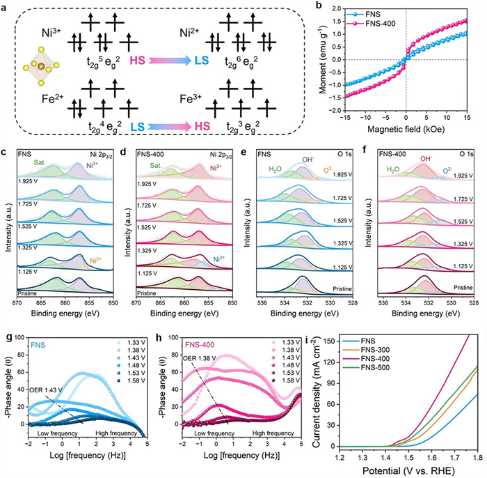 | Fig. 9. (a) Schematic diagram of the high-spin state (HS) transition of Ni3+ to the low-spin state (LS) of Ni2+ and the LS transition of Fe2+ to the HS of Fe3+. (b) Magnetic hysteresis (M-H) loops of FNS and FNS-400. (c, d) High-resolution Ni 2p3/2 XPS spectra of different catalysts at various potentials. (e, f) O 1s XPS spectra of different catalysts at various potentials. (g, h) The Bode phase plots of different catalysts at various voltages. (i) OER polarization curves of different catalysts. Reproduced with permission [111]. Copyright 2024, Wiley Publishing Group. | |
