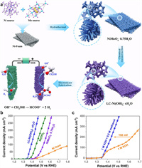 | Fig. 16. (a) Scheme of the synthesis of low coordination Ni(OH)2·xH2O catalysts and the application of boosting MOR and hydrogen evolution reaction. (b) LSV curves of different catalysts for MOR. (c) LSV curves of low coordination Ni(OH)2·xH2O catalysts with and without 0.5 mol/L methanol. Reproduced with the permission [143]. Copyright 2024, Springer. | |