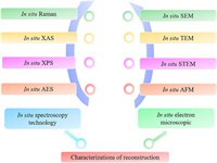2.2. Characterizations of reconstruction processRegarding monitoring the surface reconstruction process, the in situ/operando technologies play a crucial role. The characterization of surface dynamic reconstruction is an important aspect of understanding the changes and evolution of surfaces, particularly in the fields of material science, nanotechnology, and surface science [47]. Surface dynamic reconstruction refers to the process by which the morphology, chemical composition, and/or structural arrangement of a surface can undergo changes in response to various external or internal factors [48]. First, the changes in surface morphology and roughness over time have been extensively investigated using various techniques, including atomic force microscopy (AFM), scanning tunneling microscopy (STM), and electron microscopy (SEM, TEM) (Fig. 2). These techniques can provide high-resolution, real-time imaging of surface features and their evolution. Second, the spectroscopic techniques, such as in situ X-ray photoelectron spectroscopy (XPS), Auger electron spectroscopy (AES), in situ Raman spectroscopy, in situ X-ray absorption near edge spectroscopy (XANES), extended X-ray absorption fine structure spectroscopy (EXAFS), and in situ infrared (IR) spectroscopy, are used to determine the alterations in the chemical composition and bonding structures on the surface (Fig. 2) [49]. These methods can yield valuable information about the formation, transformation, and adsorption of different chemical species on the surface. Third, the diffraction techniques, such as low-energy electron diffraction (LEED) and in situ X-ray diffraction (XRD), focus on detecting the changes in the atomic-scale structure and ordering of the surface [50,51]. These techniques can reveal the formation, reconstruction, and relaxation of surface structures, as well as the presence of defects and adsorbates. Fourth, the time-resolved techniques, such as time-resolved XPS, time-resolved STM, and ultrafast laser spectroscopy, are employed to study the dynamic processes and the kinetics of surface reconstruction.