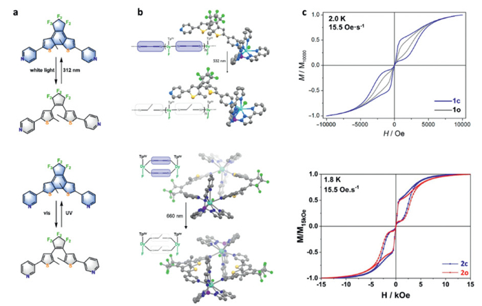 | Fig. 1. (a) Open and closed forms of the photoactive bispyridyl dithienylethene units used as a bridging ligand in 1c and 2c. (b) Single-crystal structures of 1c and 1o (top), 2c and 2o (bottom). (c) Variable field magnetization data for 1c and 1o (top) and for 2c and 2o (bottom). Reproduced with permission [48]. Copyright 2020, American Chemical Society. Reproduced with permission [54]. Copyright 2023, the Royal Society of Chemistry. | |