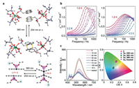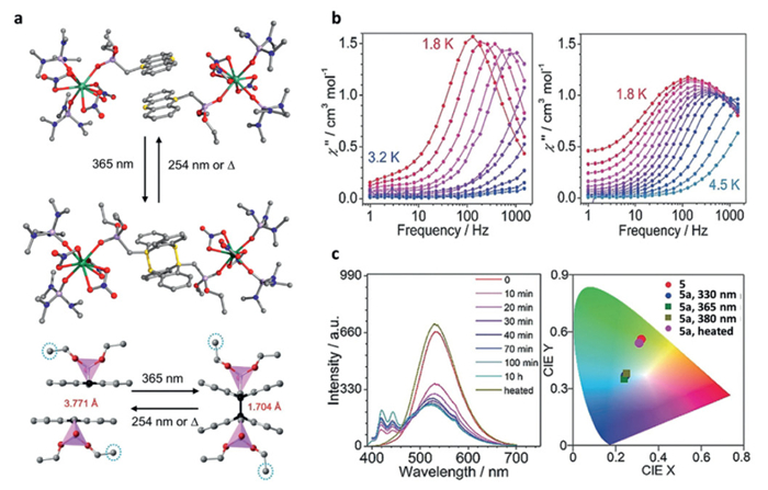 | Fig. 2. (a) Single-crystal structures of 5 and 5a. (b) The frequency dependence of the out-of-phase χ′′ of the ac susceptibilities for 5 (left) and 5a (right). (c) Photoluminescence spectra and the CIE graph of 5, 5a and 5a heated. Reproduced with permission [55]. Copyright 2018, Wiley-VCH Verlag GmbH & Co. KGaA, Weinheim. | |