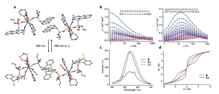 | Fig. 3. (a) Single-crystal structures of 6 and 6a. (b) The frequency dependence of the out-of-phase χ′′ of the ac susceptibilities for 6 (left) and 6a (right). (c) Photoluminescence spectra of 6, 6a and 6 heated. (d) Variable field magnetization data for 6 and 6a. Reproduced with permission [59]. Copyright 2023, Wiley-VCH GmbH. | |