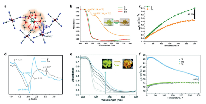 | Fig. 4. (a) Single-crystal structures of [Ln3+(18C6)(H2O)3]Fe3+(CN)6·2H2O (Ln = Eu(8) and Dy(9)). (b) UV–vis spectra for 8, 8a and 8b. Inset: photochromism of 8 at room temperature. (c) χMT versus temperature (T) for 8 and 8a. (d) EPR spectra of 9 and 9a. (e) UV–vis spectra for 9, 9a. Inset: photochromism of 9 at room temperature. (f) χMT versus temperature (T) for 9, 9a and 9b. Reproduced with permission [68]. Copyright 2015, American Chemical Society. Reproduced with permission [72]. Copyright 2021, Royal Society of Chemistry. | |