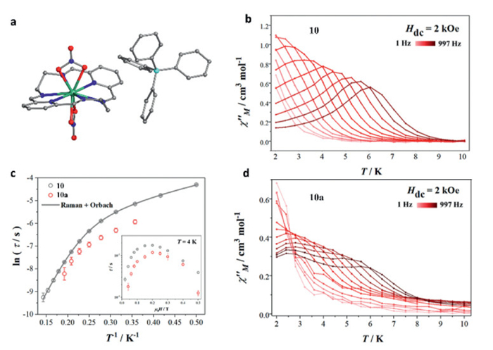| Fig. 5. (a) Single-crystal structure of 10. Variable temperature ac magnetic susceptibilities for (b) 10 and (d) 10a under a 2 kOe dc field. (c) Relaxation time ln(τ) vs. T−1 plot for 10 (gray circle) and 10a (red circle). Reproduced with permission [71]. Copyright 2023, American Chemical Society. | |