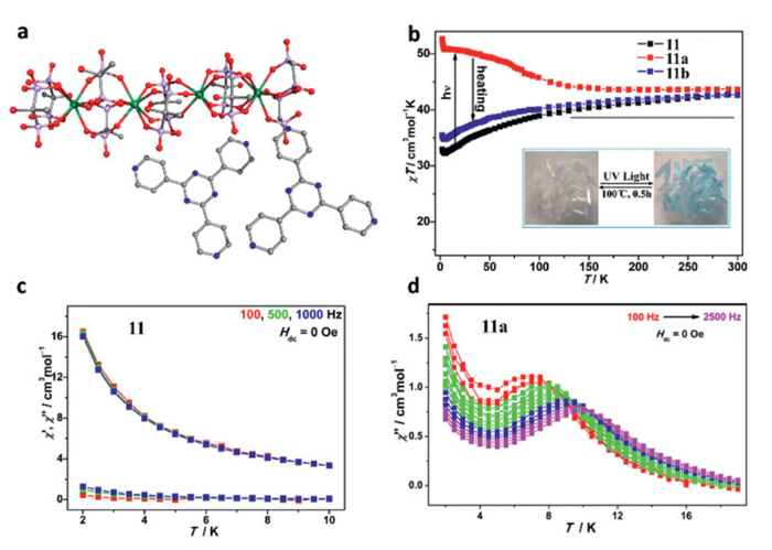 | Fig. 6. (a) Single-crystal structures of 11. (b) χMT versus temperature (T) for 11, 11a and 11b. Variable temperature ac magnetic susceptibilities for (c) 11 and (d) 11a. Reproduced with permission [70]. Copyright 2020, American Chemical Society. | |