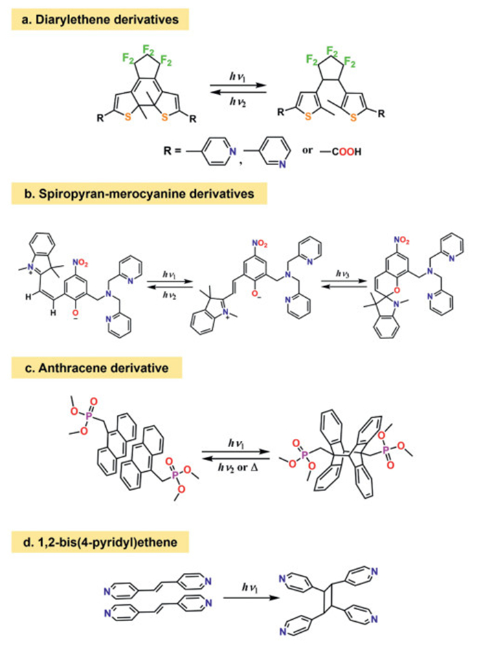 Aside from Ln-SMMs, significant efforts have been focused on the investigation of multifunctional molecular materials, which display various physical features combining magnetic properties with porosity [33], chirality [34], conductivity [35] or luminescence [36]. Such properties can coexist in a single component in perfect harmony or exhibit effective coupling or synergetic effects [37–40], providing the possibility of modulating one property with the other. In addition, an even more challenging task is the design of stimuli-responsive Ln-SMMs [41,42], whose magnetizations can be effectively controlled via external stimulus [41–43], such as pressure [44,45], solvent [46], electric potential [47] or light [48]. This may further widen the extent of their applications in information storage and molecular spintronics. Among these stimuli, light irradiation is a particularly attractive tool for this purpose because of its wildly available, environment friendly, non-invasive and mild nature, which may allow the preservation of crystallinity of complexes compared with chemical or thermal stimulus. Meanwhile, light can provide a unique opportunity for rapid, remote and precise control of magnetic characteristic with high spatial and temporal resolution. So far, several lanthanide SMMs with photoactive organic moieties displaying photoinduced magnetism regulation have been reported (Table 1). Given the significant influence of the crystal field structures and magnetic interactions on magnetic anisotropy and relaxation dynamics in lanthanide systems, the successful photo control of ligand structures or the stabilization of light-induced radicals may enable an efficient handle for spin manipulation. Therefore, a general approach to designing and synthesizing photo-tunable Ln-SMMs has been developed via introducing photoactive moieties, including dithienylethene derivatives with open and close forms [48–54], anthracene-containing ligands [55–59] and 1,2-bis(4-pyridyl)ethene(bpe) [60,61] with photocycloaddition, spiropyran-merocyanine with ring-opening and pericyclic reaction or cis-trans isomerization [62–64] and azo-based ligands with cis-trans isomerization [65,66], viologens [67–70] or macrocyclic [71,72] system with photogenerated radicals and polyoxometalates [73] with electron transfer. There are two types of photoactive systems mentioned above, one of which consists of common organic photoswitches capable of undergoing reversible structural changes between two isomers (Scheme 1) and the other is dominated by photoinduced electron transfer (PET) mechanism, containing both electron acceptors and donors to stabilize radicals for long-live charge separation. For the former, the photo-isomerization to alter the first coordination sphere of lanthanide ion is expected. However, the structural transformations in the solid state are severely constricted due to the close molecular stacking, which leads to poor isomerization dynamic and unsatisfactory photochromism. Thus, overcoming molecular crowding and increasing conformational freedom are of great significance to the effective modulation of magnetism. For the latter, the complexes contain suitable electron donors and acceptors, able to offer an efficient platform for the PET process and generate stable light-induced radicals, which not only give rise to naked-eye detectable color changes but tune the magnetic interactions and field strength of spin centers. Compared to those Ln-SMMs with photoisomerization, electron-transfer complexes display higher sensitivity, faster respond but produce less structural changes, even if the presence of radicals, which may allow the retention of crystallinity, access to establish the key structure-properties relationship. To date, the number of Ln-SMMs with light-triggered radicals is limited partly due to the monotonous type of ligands and poor chemical expansibility. It is not easy to control the CF symmetry and magnetic anisotropy as well, considering the flexible coordination patterns of lanthanide ions.