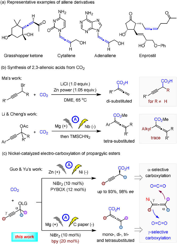 In this context, we envisaged nickel-catalyzed electroreductive carboxylation of propargylic esters with CO2 would offer a versatile approach to achieve a general and modular catalytic assembly of 2,3-allenoic acids in a regiodivergent manner. Apart from controlling the regioselectivity, avoiding competitive further reductive carboxylation of the allene moiety [97], as well as the application to the synthesis of differently substituted 2,3-allenoic acids, also represent challenges to be overcome to validate this hypothesis. Herein, we present a feasible nickel-catalyzed electrocatalytic carboxylation of propargylic esters with CO2 to produce 2,3-allenoic acids with a broad substrate scope. Not only acyclic propargylic esters but also cyclic propargylic carbonates serve as effective substrates, facilitating the synthesis of mono-, di-, tri-, and tetra-substituted 2,3-allenoic acids effectively under mild conditions (Scheme 1c).