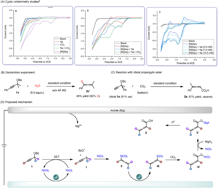 To elucidate the reaction mechanism, cyclic voltammetry (CV) analyses were initially conducted to study the electrochemical process at the cathode. The results revealed that the nickel complex exhibits two reduction potential peaks: The first at −1.3 V and the second at −2.0 V, corresponding to the Ni(Ⅱ)/Ni(Ⅰ) and Ni(Ⅰ)/Ni(0) processes, respectively. The first reduction potential peak is more positive than that of CO2 and propargylic ester 1a, indicating that during the reaction process, the Ni(Ⅱ) complex is initially reduced to Ni(Ⅰ) (Scheme 3A-a). Upon the addition of 1a to the nickel complex, the current at −1.3 V increases significantly, indicating that the Ni(Ⅰ) complex generated after the first (single-electron transfer) SET reduction should interact with 1a immediately, leading to an increase in the current. During this process, new complexes might be formed and subsequently further electrolyzed, giving rise to new reduction peaks. Further introduction of CO2 shows no obvious changes in the reduction peak at −1.3 V, while the current at the secondary reduction peak increases significantly, indicating that the new species generated after the secondary reduction should react with CO2 immediately (Scheme 3A-b). Furthermore, the influence of the concentration of 1a on the reduction of the Ni complex was studied. As the concentration of 1a increases, the current at −1.3 V increases, whereas there is no substantial increase in current at −2.0 V (Scheme 3A-c). This further substantiates that it shoulbe the Ni(Ⅰ) species, rather than the Ni(0) species, that reacts with propargylic ester 1a during the reaction course.