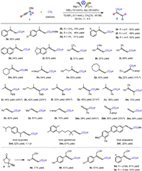 Next, we explored the synthesis of di-substituted 2,3-allenoic acids. The carboxylation of terminal propargylic esters derived from aldehydes with CO2 proceeded smoothly, yielding the desired 2,4-disubstituted 2,3-allenoic acids 2x-2z bearing 4-phenyl, 4-methyl, and 4-n-amyl substituents with 70%−82% yield. Meanwhile, the reaction of internal propargylic esters derived from formaldehyde delivered the 2,2-disubstituted 2,3-allenoic acids 2aa and 2ab with 2-phenyl and 2-n-amyl substituents in 38% and 45% yield, respectively. Gratifyingly, structurally complex propargylic esters derived from drugs such as ibuprofen, gemfibrozil (Lopid), and adapalene also afforded the corresponding 2,4-disubstituted 2,3-allenoic acids 2ad-2af with good yields. Lastly, the construction of the simplest monosubstituted 2,3-allenoic acid was attempted, and the reaction of 2-propynyl benzoate successfully afforded 2,3-butadienoic acid 2ac in 84% yield.