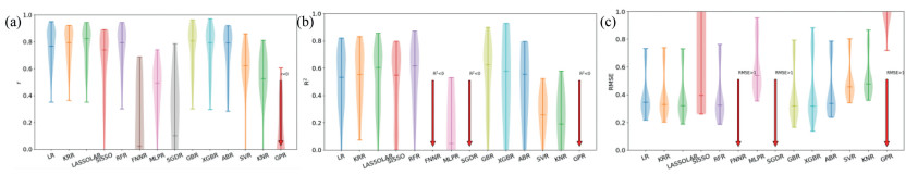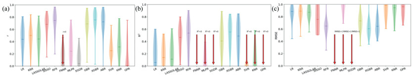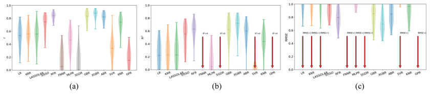 | Fig. 2. In terms of ΔG(NO3), the evaluation results of each algorithm on the testing set: (a) Result of r, (b) result of R2, (c) result of RMSE. | |