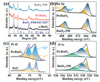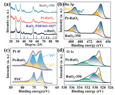 | Fig. 1. (a) XRD patterns of c-RuO2, RuO2–350, Pt-RuO2. (b) Ru 3p spectra of RuO2–350 and Pt-RuO2. (c) Pt 4f spectra of Pt-RuO2 and Pt/C. (d) O 1s spectra of RuO2–350 and Pt-RuO2. | |