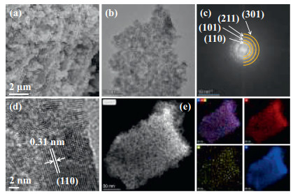 | Fig. 2. (a) SEM, (b) TEM, (c) SAED, (d) HR-TEM, (e) HAADF images and corresponding EDS mapping of Pt-RuO2. | |