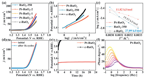 | Fig. 3. (a) OER performance, (b) Tafel slope and (c) activation energy of c-RuO2, RuO2–350 and Pt-RuO2. (d) Cyclic stability of Pt-RuO2. (e) Chronopotentiometry test of c-RuO2 and Pt-RuO2. (f) Bode plots of Pt-RuO2 at various potential from 1.40 V to 1.58 V vs. RHE. | |
