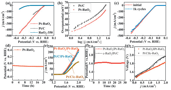 | Fig. 4. (a) HER performance and (b) Tafel slope of Pt-RuO2 and Pt/C. (c) Cyclic stability and (d) chronopotentiometry test of Pt-RuO2. (e) Overall water splitting performance and (f) stability of various electrocatalysts. (g) I-V polarization curves of membrane electrode assembly from Pt/C||RuO2 and Pt-RuO2||Pt-RuO2 at 80 ℃. | |