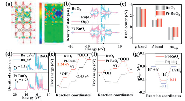 | Fig. 5. (a) Charge distribution of Pt-RuO2. (b) Density of state, (c) band center, (d) eg filling and OER energy barriers of RuO2 and Pt-RuO2 with (e) U = 0 V and (f) U = 1.23 V. (g) Gibbs free energy for hydrogen of Pt-RuO2 and Pt (111). | |