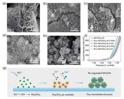 | Fig. 2. The influence of the concentration of Ru3+ in the soaking system on the growth process of the RuT-NiFeOHx-5h. SEM images of the RuT-NiFeOHx-5h at different Ru3+ addition levels: (a) 0 mol/L, (b) 0.0001 mol/L, (c) 0.001 mol/L, (d) 0.005 mol/L, and (e) 0.01 mol/L. (f) The polarization curves of RuT-NiFeOHx-5h at different Ru3+ concentrations. (g) Schematic diagram of the synthesis mechanism of RuT-NiFeOHx-5h catalyst. | |