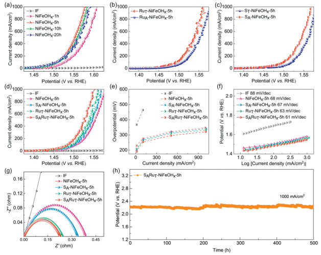 | Fig. 3. (a) Polarization curves of NiFeOHx with different immersion time with iR compensation. (b) Comparison of polarization curves of NiFeOHx-5h with diverse Ru3+ doping methods with iR compensation. (c) Comparison of polarization curves tests of NiFeOHx-5h with diverse S2- doping strategies with iR compensation. Comparison of (d) polarization curves and (e) overpotentials of IF, NiFeOHx-5h, RuT-NiFeOHx-5h, SA-NiFeOHx-5h, and SARuT-NiFeOHx-5h catalysts in 1.0 mol/L KOH with iR. (f) Tafel and (g) Nyquist plots of different samples with iR compensation. (h) Chronopotentiometry curve of SARuT-NiFeOHx-5h at a current density of 1000 mA/cm2 for 500h without iR compensation. | |