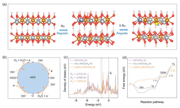 | Fig. 4. (a) The optimized structural model of NiFeOHx-5h, RuT-NiFeOHx-5h, and SARuT-NiFeOHx-5h. (b) AEM mechanism of OER on the surface of catalyst. (c) DOS diagram of NiFeOHx-5h, RuT-NiFeOHx-5h, and SARuT-NiFeOHx-5h. (d) The calculated Gibbs free energy and the corresponding values. | |