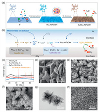 | Fig. 1. (a) Schematic illustration of the synthesis process of SARuT-NiFeOHx-5h catalyst. (b) Synthesis mechanism of SARuT-NiFeOHx-5h. (c) XRD patterns of the prepared NiFeOHx-5h, RuT-NiFeOHx-5h, and SARuT-NiFeOHx-5h. Comparison of the SEM images of (d) NiFeOHx-5h, (e) RuT-NiFeOHx-5h, and (f) SARuT-NiFeOHx-5h. (g) TEM and (h) HRTEM images of SARuT-NiFeOHx-5h. | |