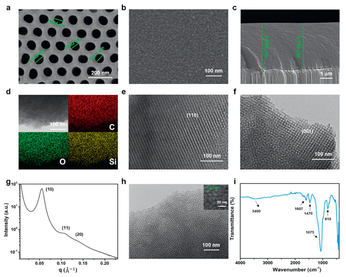 | Fig. 1. Characterization of the MCS/AAO hybrid membrane. SEM image of the (a) bare AAO surface. SEM images of (b) the MCS membrane and (c) cross-section of MCS/AAO hybrid membrane. (d) STEM image and EDS mapping of the element distribution on the surface of the MCS membrane. TEM image of MCS membrane film along (e) the [110] zone axis and (f) the [001] zone axis. (g) SAXS pattern of the MCS membrane. (h) TEM image of the MCS membrane of MCS/AAO hybrid membrane with two-dimensional (2D) hexagonal symmetry structure. Inset: the magnified image of the MCS membrane. (i) The FT-IR spectra of MCS membrane. | |