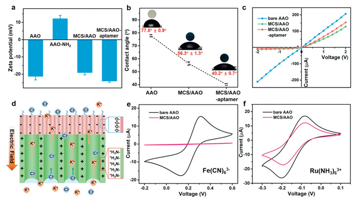 | Fig. 2. Electrochemical detection and wettability characterization of the MCS/AAO hybrid membrane. (a) The zeta potential of the bare AAO, AAO—NH2, MCS/AAO, and MCS/AAO-aptamer. (b) The contact angle of the bare AAO, MCS/AAO and MCS/AAO-aptamer. (c) The ionic current curves of the bare AAO, MCS/AAO and MCS/AAO-aptamer, n = 5. (d) Schematic illustration of charge distribution of the MCS/AAO hybrid membrane. CV measurements of the bare AAO (black curve) and MCS/AAO hybrid membrane (red curve) electrode in 10 mmol/L KCl containing 0.5 mmol/L (e) Ru(NH3)63+ and (f) Fe(CN)63−. The scan rate was 50 mV/s. | |