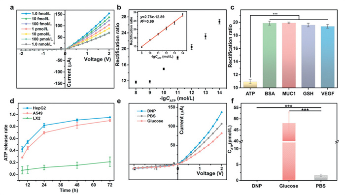 | Fig. 3. The quantitative detection of cell secretion ATP. (a) I-V properties of the MCS/AAO-aptamer treated with different concentrations of ATP solution, n = 5. (b) Recetification ratio of the MCS/AAO-aptamer toward increasing ATP concentrations. Inset: The linear relationship between the ion rectification ratio and ATP concentration, n = 5. (c) Selectivity assessment of this MCS/AAO-aptamer toward ATP, BSA, MUC1, GSH, and VEGF. (d) The ATP release rate ((R0–R)/R0) of three cell lines (HepG2 cells, LX2 cells, and A549 cells) within 72 h. R0 was the ICR of MCS/AAO-aptamer at 0 h, R was the ICR of MCS/AAO-aptamer treated with different cells at different times. (e) The ionic current curves of the MCS/AAO-aptamer after the HepG2 cells treated with PBS, 2, 4-dinitrophenol (DNP, ATP inhibitor), and glucose (ATP inducer), n = 5. (f) The concentrations of ATP secreted from HepG2 cells induced by PBS, DNP, and glucose was calculated by calibration equation, n = 5. ***P < 0.001, **P < 0.01, P < 0.05. | |