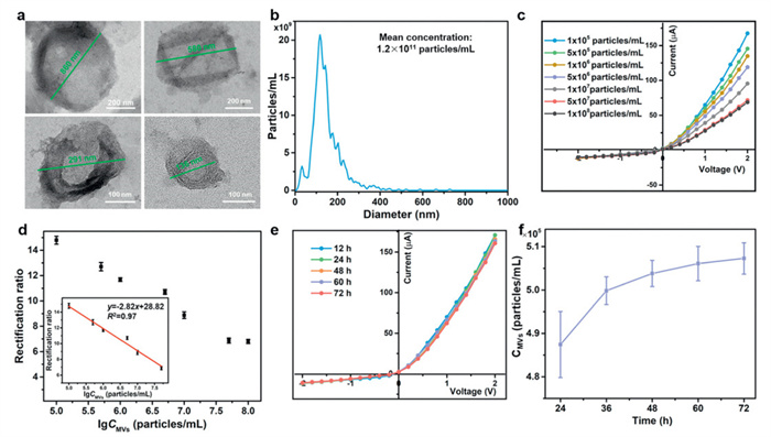 | Fig. 4. Detection of MVs secreted by HepG2 cells. (a) The TEM images of MVs secreted by HepG2 cells. (b) The MVs concentration and size distribution determined by NTA, mean concentration was 1.2 × 1011 particles/mL and the size distribution was between 40 nm and 750 nm with an average of 137.4 nm. (c) I-V properties of the MCS/AAO-aptamer hybrid membranes treated with different MVs concentrations, n = 5. (d) Recetification ratio of the MCS/AAO-aptamer toward increasing MVs concentrations. Inset: The linear relationship between the ion rectification ratio and MVs concentration, n = 5. (e) I-V curves of the MCS/AAO-aptamer membranes under different secretion times, n = 5. (f) The concentrations of MVs secreted from HepG2 cells was calculated by calibration equation, n = 5. | |