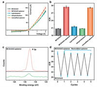 | Fig. 5. The regeneration of the MCS/AAO-aptamer. (a) I-V properties of the MCS/AAO, MCS/AAO-aptamer, hybridization, dehybridization, and remodified aptamer. (b) The rectification ratio during the regeneration of the MCS/AAO-aptamer interface. (c) XPS analysis of the surface of MCS/AAO before and after cleaning the DNA aptamer. (d) Stability and reversibility of the MCS/AAO-aptamer. Changes in ICR before and after several cycles of MCS/AAO membrane remodification with aptamer. | |