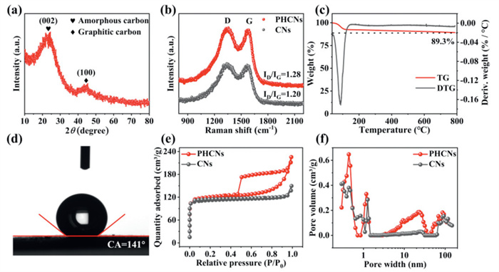 | Fig. 2. (a) XRD pattern. (b) Raman spectrum. (c) TGA curve. (d) Contact angle. (e) N2 adsorption-desorption isotherms. (f) Pore size distribution. | |