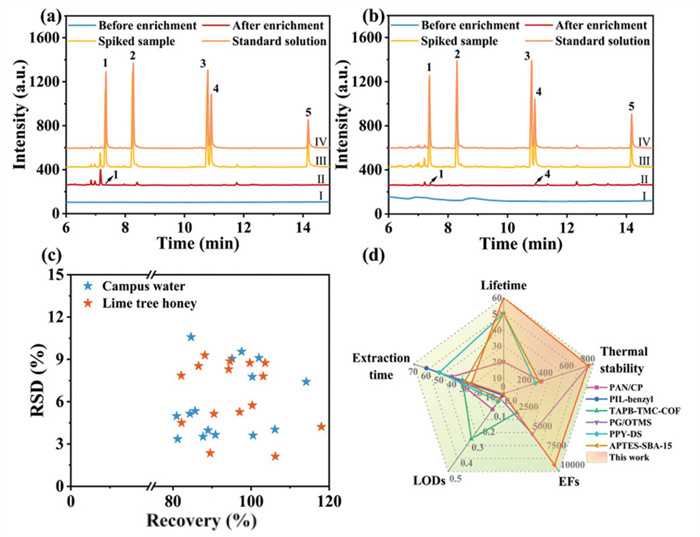 | Fig. 4. The chromatogram for analysis of campus lake water (a) and lime tree honey (b). Direct injection of real sample (Ⅰ) with volume of 1 μL, extraction of real sample (Ⅱ) with PHCNs as fiber coating, chromatogram of spiked real sample (20 ng/mL) after extraction (Ⅲ), and extraction of mixed standard solution concentration of 20 ng/mL (Ⅳ). Peak identification: (1) ACE, (2) FLU, (3) PHE, (4) ANT, (5) PYR. The recoveries and RSDs of target PAHs in two real samples using the PHCNs based HS-SPME fiber coating (c). Comparison of PHCNs coated fiber with other fiber coatings for determination of PAHs (d). | |