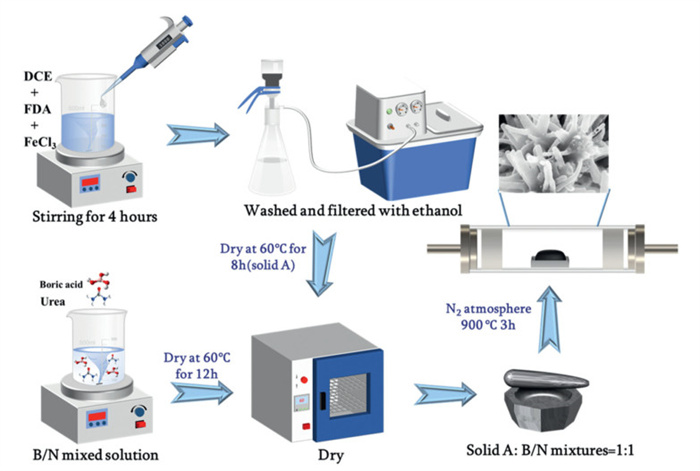 Hypercrosslinked polymers were prepared via the Friedel–Crafts reaction with anhydrous FeCl3 as a catalyst, using an externally added crosslinking agent [22]. First, 1,2-dichloroethane (DCE, 20.00 mL) and anhydrous FeCl3 (3.211 g) were added to a beaker and stirred well until fully dissolved. Then, dimethoxymethane (FDA, 5.41 mL) was added, the mouth of the beaker was covered with a sealing film, pyrrole (1.40 mL) was added quickly using a pipette gun, and the product obtained from the reaction was stirred at 25 ℃ for 4 h. The product obtained from the reaction was washed and filtered through ethanol. The product obtained from the reaction was washed with ethanol and filtered. The solid (solid A) obtained after filtration was then placed in a vacuum-drying oven for drying. Then, 3.05 g of boric acid and 3.00 g of urea were placed into a beaker with pure water to be completely dissolved. Then, the beaker was put into the oven at 60 ℃ to dry the water and obtain the B/N mixture as a solid (solid B). Then, 6.00 g solid B and 6.00 g solid A were mixed in a mortar and ground uniformly to obtain a solid mixture (solid C). Solid C was put in nitrogen at a 5 ℃/min heating rate, 900 ℃, for 3 h of carbonisation to obtain the final product hydrangea-like B/N co-doped carbon material (termed hydrangea-like BNC) (Fig. 1) [23].