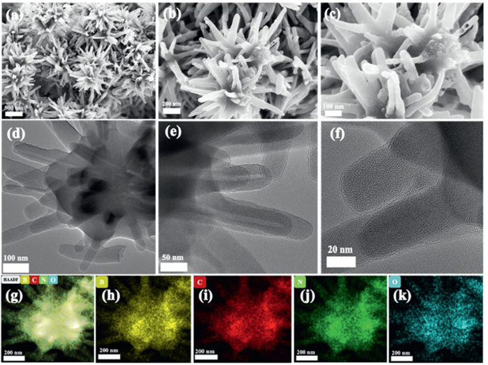 SEM and TEM were used to analyse the morphology and structure of the hydrangea-like BNC. Figs. 2a–c show SEM images of the hydrangea-like BNC. The overall morphology of the BNC is hydrangea-like, with rod-like projections. Figs. 2d–f show transmission electron micrographs of the hydrangea-like BNC. The overall morphology of the hydrangea-like BNC is hydrangea-like, that is, composed of multiple rod-like structures that are spliced together to form a hydrangea. Figs. 2g–k show energy-dispersive X-ray spectroscopy (EDS) images that indicate that the four B, N, C, O elements are uniformly distributed throughout the material.