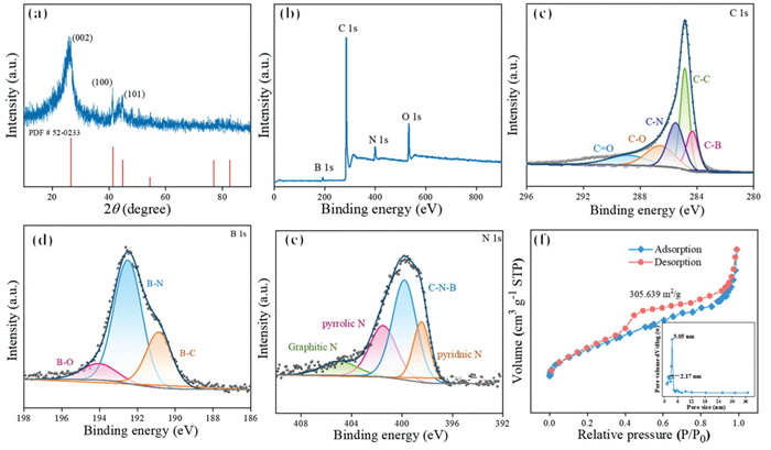 | Fig. 3. (a) XRD image of hydrangea-like BNC. (b) XPS energy spectrum of hydrangea-like BNC. XPS energy spectrum of (c) C 1s, (d) B 1s, (e) N 1s. (f) Absorption and desorption isothermal curves and pore size fractions of hydrangea-like BNC. | |
