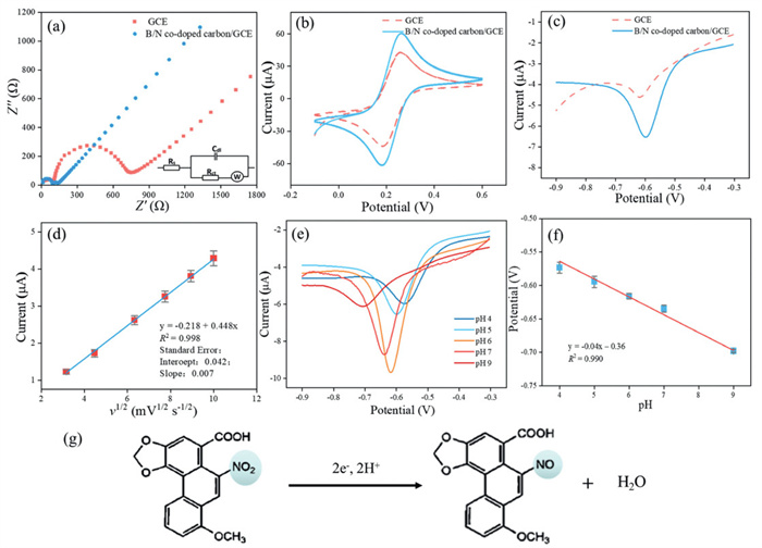 | Fig. 4. (a) Nyquist diagram of GCE and hydrangea-like BNC/GCE. (b) CV of the GCE and hydrangea-like BNC/GCE in 0.1 mol/L KCl containing 5 mmol/L [Fe(CN)6]3-/4-. (c) SWV of the GCE and hydrangea-like BNC/GCE in 0.1 mol/L PBS with 15 µmol/L AA. (d) Linear relationship between the square root of the scan rate and the current response. (e) SWV current response curves at different pH values (4, 5, 6, 7, 9). (f) Linear relationship between the pH and potential. (g) Aristolochic acid detection mechanism. | |