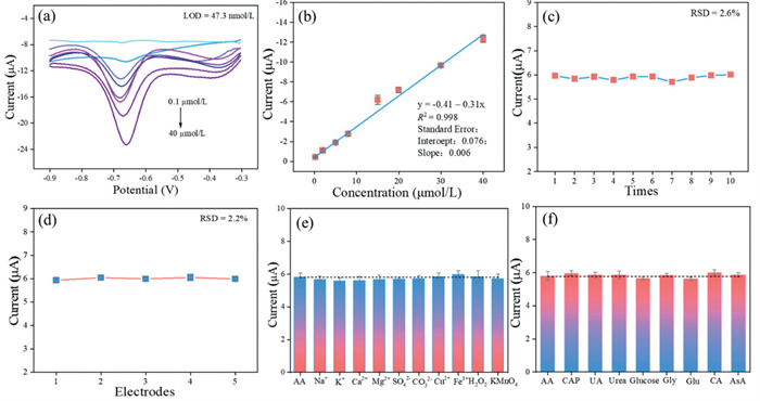The ability of electrochemical sensors to adapt to complex environments, the number of times they can be reused, and the accuracy of testing are important indicators of their applicability. Therefore, we analysed and investigated their reproducibility and immunity to interference. Repeatability experiments measure the results of repeating an experiment many times without changing any conditions, and in the AA buffer solution containing 15 µmol/L, 10 continuous tests were performed. Fig. 5c shows the results. The fold line has a slight fluctuation, the difference between the test results is within 5%, and the RSD value is 2.6%, which indicates that the discretization of the test results from the mean value is good and that the data are close to the mean value. Fig. 5d shows the results of reproducibility tests conducted in the same buffer solution environment, using five different electrodes for testing and analysis. The five electrodes were measured three times, and the average values were similar. Moreover, the error was small, and the RSD was 2.2%, indicating that the results are highly accurate and that the test data are stable, meaning that the results are reproducible. The anti-interference ability is the key for the sensor to accurately detect AA in complex environments. To test the performance of this sensor, we added six cations (Na+, K+, Ca2+, Mg2+, Cu2+, Fe3+) and two anions (SO42-, CO32-) at concentrations 100 times higher than that of AA, and organic substances (chloramphenicol, uric acid, urea, glucose, glycine, glutamic acid, citric acid, and ascorbic acid) at concentration 50 times higher than that of AA, and two oxidizing agents (H2O2, KMnO4) at the same concentration as AA to a buffer solution containing 15 µmol/L of AA. Figs. 5e and f show the results of the subsequent analysis. The test results of the sensor for AA in the inorganic and organic environments were relatively stable, and the fluctuations of the electrochemical signal values were small, with peaks and troughs within 5%. These results indicate that the sensor had a better ability to resist interference in a complex environment, had a good selectivity for AA, and was able to analyze the AA accurately in a complicated testing environment. Hence, AA can be accurately analysed in a complex environment for real sample testing.