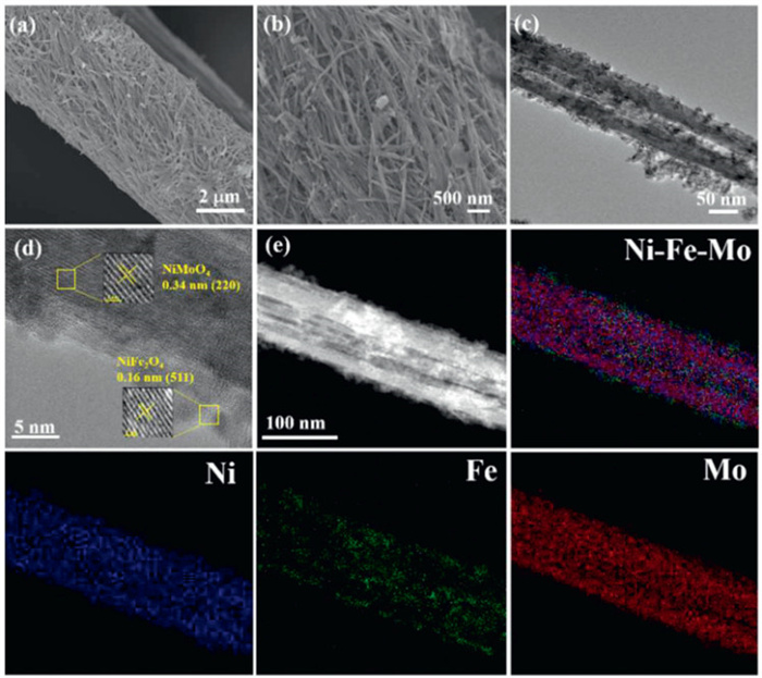 | Fig. 2. (a, b) SEM images of NiFe2O4/NiMoO4, (c) TEM image, (d) HRTEM image and (e) STEM image and the corresponding EDS elemental mapping spectra of NiFe2O4/NiMoO4. | |
