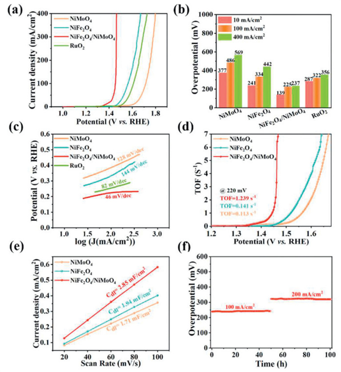 The OER performance of NiMoO4, NiFe2O4, NiFe2O4/NiMoO4 and RuO2 electrocatalyst as working electrodes was assessed using a conventional three-electrode systems in simulated alkaline seawater (1 mol/L KOH + 0.5 mol/L NaCl). In Figs. 4a and b, NiFe2O4/NiMoO4 requires low overpotential of 139 mV to drive the current density of 10 mA/cm2, which is much lower than that of NiMoO4 (377 mV), NiFe2O4 (241 mV) and RuO2 (287 mV). Furthermore, it only requires an overpotential of 237 mV to achieve the current density of 400 mA/cm2, which is much lower than that of NiMoO4 (569 mV), NiFe2O4 (442 mV) and RuO2 (356 mV) and other reported electrocatalysts (Table S1 in Supporting information), demonstrating its superior OER electrocatalytic activity. The result indicates that the plentiful heterostructure interface formed by bimetallic oxides exposes more active sites for enhancing the intrinsic activity. Additionally, the Tafel slopes of different electrocatalysts calculated from the LSV curves serves as an important parameter in electrochemical processes for evaluating the reaction kinetics. As shown in Fig. 4c, the Tafel slope of NiFe2O4/NiMoO4 (46 mV/dec) is significantly smaller than that of NiFe2O4 (144 mV/dec), NiMoO4 (128 mV/dec) and RuO2 (82 mV/dec), which indicates faster reaction kinetics for OER and decreasing the reaction overpotential [22,45]. More importantly, the TOF of NiFe2O4/NiMoO4 electrode at an overpotential of 220 mV is 1.239 s-1, which is much higher than that of NiMoO4 (0.113 s-1) and NiFe2O4 (0.141 s-1), suggesting that the electrocatalyst has more active sites and improves catalytic performance (Fig. 4d). The electrochemical surface area (ECSA) is a crucial parameter for assessing the electrocatalytic performance of various electrodes in the reaction process (Fig. S8 in Supporting information), which was calculated using Cdl. Fig. 4e shows current densities and scan rates have a strong linear connection, and the calculated Cdl value of NiFe2O4/NiMoO4 is 2.85 mF/cm2, which is higher than that of NiMoO4 (1.71 mF/cm2) and NiFe2O4 (1.94 mF/cm2), respectively. The stability is another important factor determining the catalytic performance of electrocatalysts for seawater decomposition, as the abundant salts in seawater are highly corrosive. Fig. 4f is the durability of the NiFe2O4/NiMoO4 electrode evaluated at 100 and 200 mA/cm2 by multistep chronopotentiometry. It has no significant change in voltage after 100 h of continuous stability testing, illustrating the NiFe2O4/NiMoO4 electrocatalyst has excellent stability. Therefore, the above results illustrate NiFe oxide and oxy(hydroxide) on the anode surface are the active sites that are not only responsible for the excellent OER performance, but also contribute to the superior chlorine corrosion-resistance [37]. Additionally, the self-supported three-dimensional heterostructure offers abundant active sites, efficient charge transfer and rapid gaseous product releasing, which also account for the promoted OER [46].