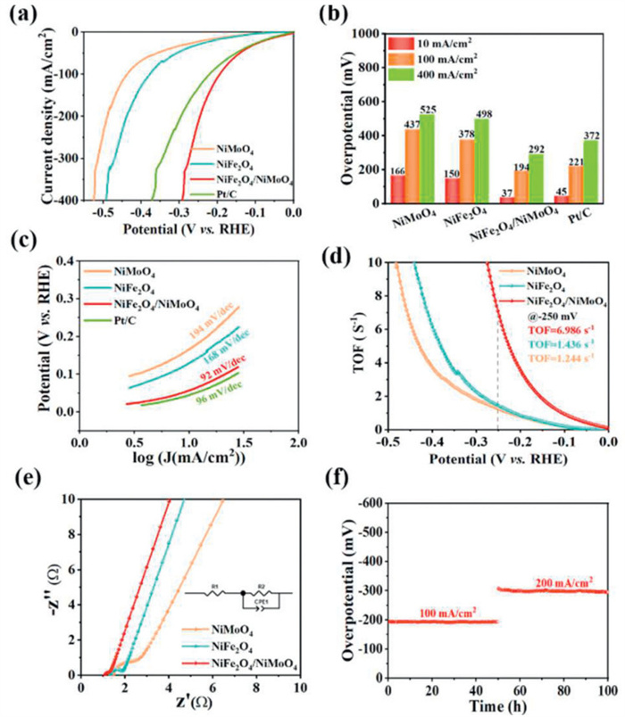 | Fig. 5. (a) LSV curves for HER, (b) histogram of corresponding overpotential at different current densities, (c) Tafel plots, (d) TOF and (e) Nyquist plots of NiMoO4, NiFe2O4 and NiFe2O4/NiMoO4 electrocatalysts. (f) Chronoamperometric curves of NiFe2O4/NiMoO4 at 100 and 200 mA/cm2 for HER in simulated alkaline seawater (1 mol/L KOH + 0.5 mol/L NaCl). | |