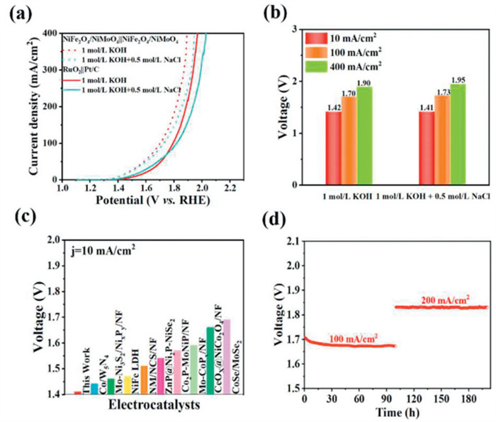 | Fig. 6. (a) Overall seawater splitting of NiFe2O4/NiMoO4‖NiFe2O4/NiMoO4 and Pt/C‖RuO2. (b) Corresponding voltages at j = 10, 100 and 400 mA/cm2. (c) Splitting voltages comparison of different electrodes. (d) Chronoamperometric curve of NiFe2O4/NiMoO4‖NiFe2O4/NiMoO4 at 100 and 200 mA/cm2 in simulated alkaline seawater (1 mol/L KOH + 0.5 mol/L NaCl). | |