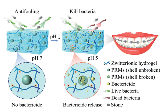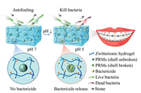 | Fig. 1. Schematic of the zwitterionic hydrogel (ZH) coating containing pH-responsive microcapsules (PRMs), showing dual functions of anti-fouling and bacteria killing for orthodontics appliances. | |