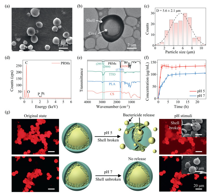 | Fig. 2. Characterization of PRMs and their pH-responsive properties. (a) SEM characterization of PRMs. (b) TEM image confirmed the core-shell structure of the PRMs. (c) Particle size distribution of PRMs (D refers to diameter, N = 158). (d) EDX data of P element verifies successful bactericide loading. (e) FT-IR for PRMs, TTO, PLA, and CS confirms the composition of PRMs. (f) Quantitative release profile of PRMs. (g) Schematic, fluorescence images of PRMs pH responsive behavior. The insert shows the SEM images of PRMs after pH stimuli. Under pH 5, red color appeared around the PRMs compared to the original state. The results showed that DiI pre-stained TTO release rapidly via PRMs shell broken. In contrast, rare red color was obtained around the PRMs implies that PRMs kept its structural integrity under pH 7. The pH stimuli time is 10 min. | |