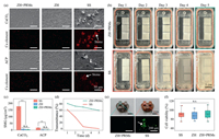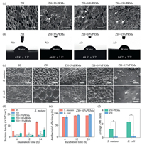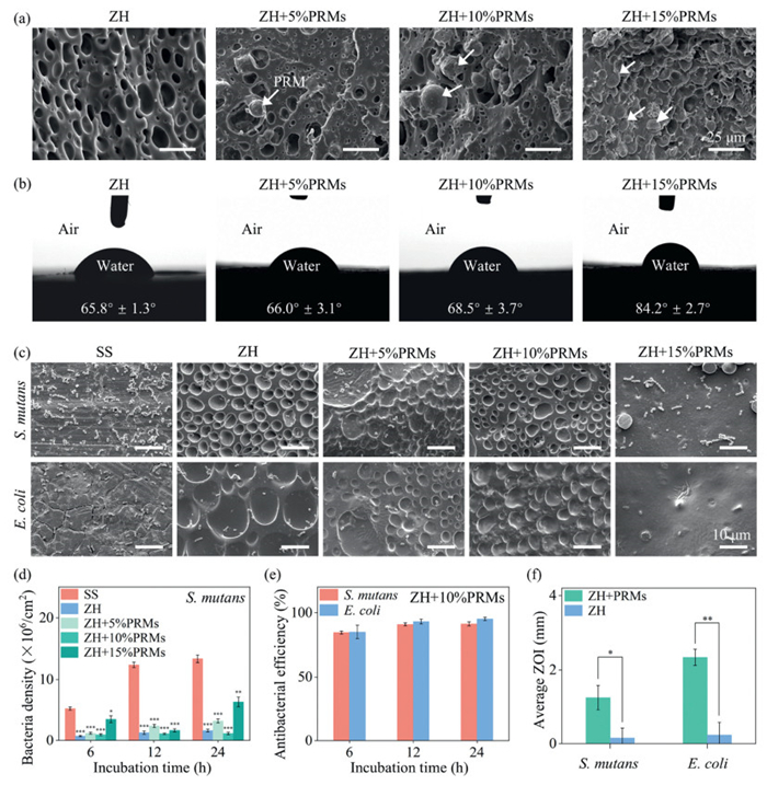 | Fig. 3. Characterizations and antibacterial property of ZH+PRMs. (a) Cross-sectional SEM images of ZH+PRMs demonstrates the successful incorporation of ZH and PRMs. The arrows indicate PRMs. (b) WCAs of ZH+PRMs demonstrate that surface hydrophobicity rose as PRMs concentration increased. (c) SEM images of adhesion behavior of S. mutans and E. coli on different substrate surfaces after 24 h incubation. (d) Quantitative analysis of S. mutans density. The significance analysis was compared with SS. (e) The antibacterial efficiency of ZH+10%PRMs coating against S. mutans and E. coli. The ZH+10%PRMs coating showed the best antibacterial effect. (f) Average ZOI of ZH+PRMs. The incorporation of PRMs significantly improved bactericidal property of the coatings. P < 0.05, **P < 0.01, ***P < 0.001. | |