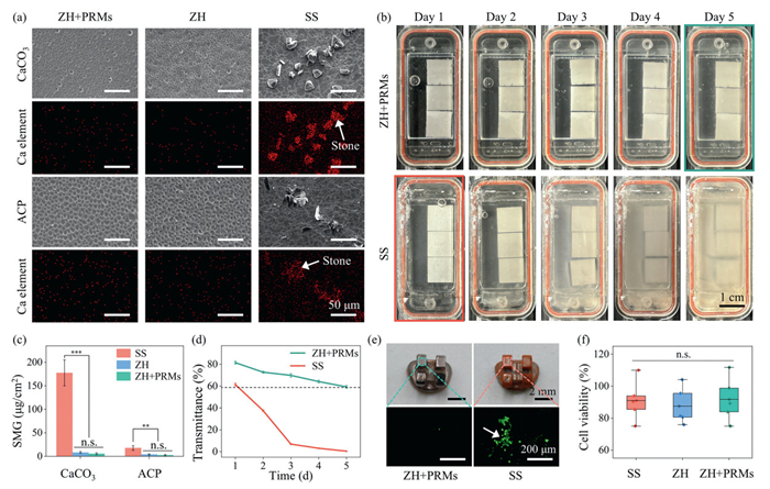 | Fig. 4. Anti-calculus property and anti-biofouling property in an in vitro oral model of ZH-SS+PRMs. (a) Representative SEM and Ca EDX images of the ZH-SS+PRMs after 24 h scaling. (b) The optical images of flow cells containing ZH+PRMs coated SS after incubating in flowing artificial saliva (with S. mutans and sucrose). (c) SMG value of ZH+PRMs from two main minerals (i.e., CaCO3 and ACP). (d) Light transmittance at 600 nm of flow cells containing ZH+PRMs and SS after incubating in flowing artificial saliva. The light transmittance of ZH+PRMs on day 5 was similar to that of SS on day 1, demonstrating that ZH+PRMs extends the crystal biofilm inhibition effect from day 1 to day 5. (e) The optical images of ZH+PRMs coated and SS brackets and corresponding fluorescence images after incubating with a saturated mineral solution containing bacteria. The deposited Ca2+ was stained by Calcein. The green color arrow headed in fluorescence images indicates deposited stone. (f) Biocompatibility of ZH+PRMs. n.s.: P > 0.1; **P < 0.01; ***P < 0.001. | |