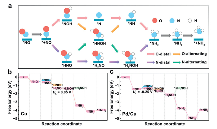 | Fig. 3. The NORR pathways toward NH3 production. (a) Schematic illustration of the possible NORR pathways toward NH3, including O-distal, O-alternating, N-distal, and N-alternating pathways. Free energy diagrams of NORR over (b) Cu and (c) Pd/Cu surfaces. | |