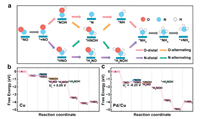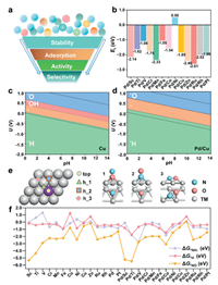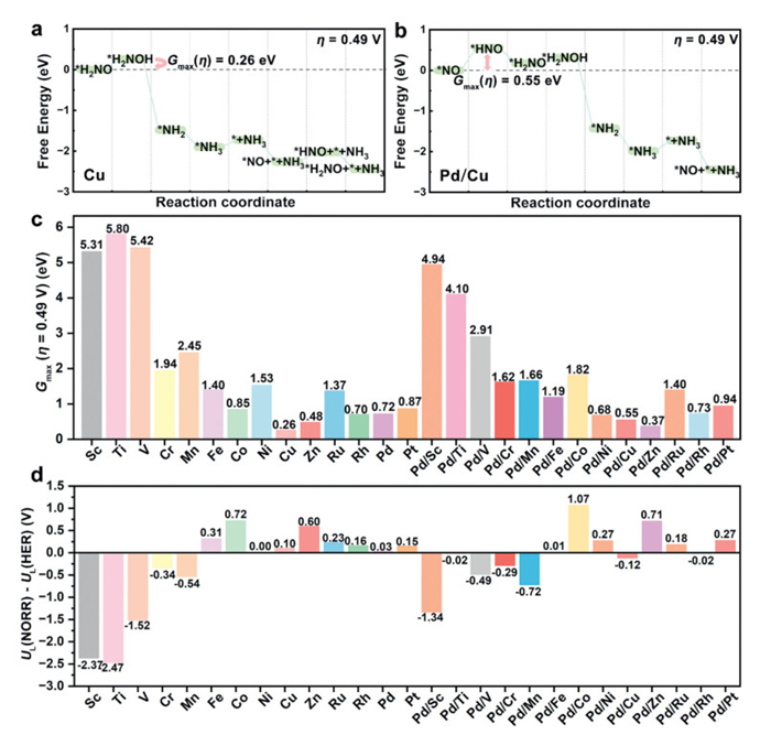 | Fig. 4. The catalytic activity and selectivity of catalysts. Free energy diagrams of NORR over (a) Cu and (b) Pd/Cu at η = 0.49 V vs. RHE after renumbering the steps so that the reaction intermediate with the lowest free energy locates at the beginning of the reaction coordinate. (c) The Gmax(η = 0.49 V) values of all catalysts. (d) The differences between UL(NORR) and UL(HER) of all catalysts. | |