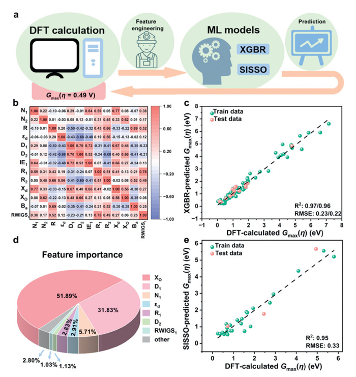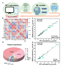 | Fig. 5. Machine learning investigations. (a) Machine learning workflow with feature engineering. (b) Heat map inferred by Pearson's correlation coefficient. (c) Comparison between DFT-calculated and ML-predicted Gmax(η = 0.49 V). (d) The ranking of the important features of XGBR. (e) Comparison between DFT-calculated and SISSO-predicted Gmax(η = 0.49 V). | |